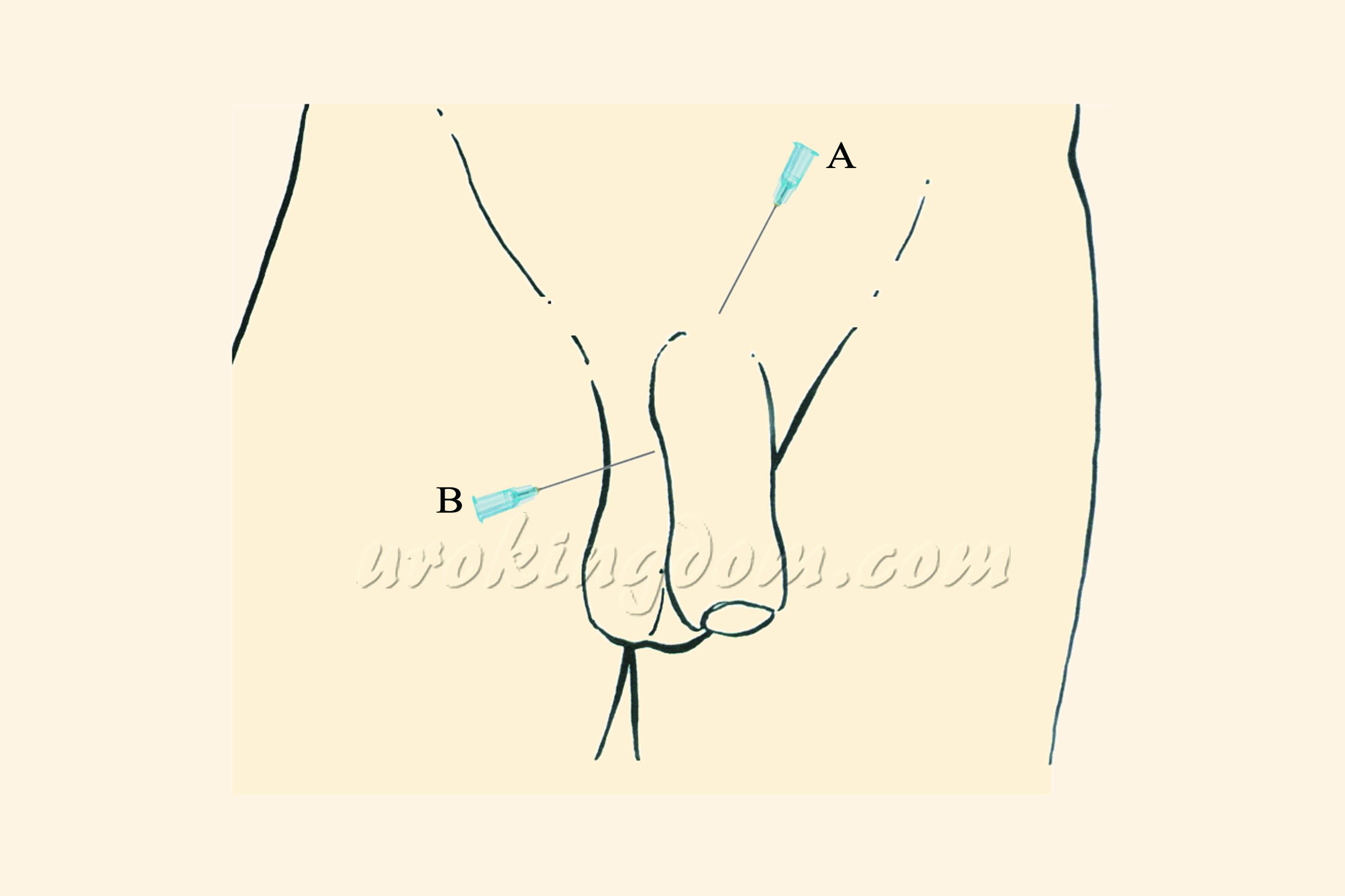 圖一:雙重局部麻醉技術,包括背神經近枝阻斷術、陰莖腳阻斷術(A)及周陰莖基部組織阻斷術(B),只在陰莖根部注射局部麻醉藥物。