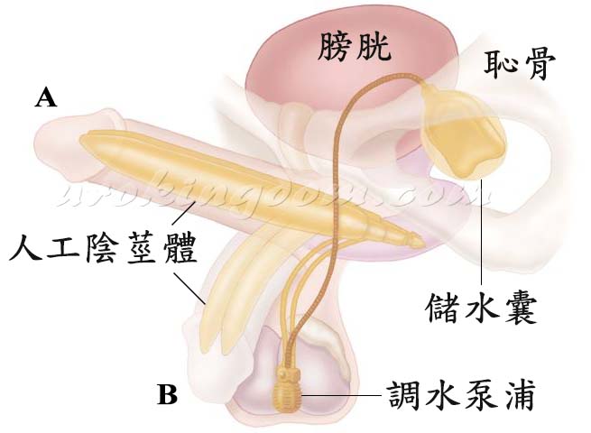 如果是植入三件充水式人工陰莖,另需將調水泵浦植入陰囊中,儲水囊植於恥骨後、膀胱前方的空間,三個物件之間以蜿蜒的管線相連接(圖五)。待人工陰莖物件都妥善植入後,使用細小縫線分層縫合傷口,並立即以紗布纏繞包紮完成手術。擠壓置於陰囊內的調水泵浦,人工陰莖體即可充水勃起,立即進行性行為;擠壓調水泵浦的另一處開關,即可消軟人工陰莖體,回復下垂狀態(圖四)。此項精細的手術出血量極少,手術過程中如偶遇出血點,不使用電燒止血,而使用微細縫線綁紮止血,以避免造成鄰近組織、動脈血管及神經的熱傷害,減少可能的併發症。