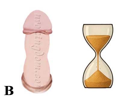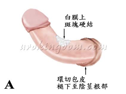 圖2:陰莖白膜受創傷後癒合異常,導致白膜內過度形成疤痕組織(纖維斑塊或硬結)、陰莖縮短,特別是在勃起時最為明顯。A)白膜背側的斑塊硬結造成鉸鏈效應,陰莖向上彎曲、B)白膜中間一段縮窄的沙漏式變形。