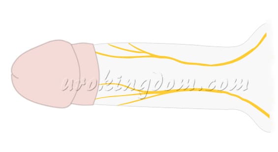 陰莖背神經是陰部神經(Pudendal nerve)最深的分枝。陰部神經源於第2,3,4節薦椎神經,沿著骨盆壁內側行走,伴隨陰部內動脈穿越陰部神經管,分出會陰神經(perineal nerve)及陰莖背神經。陰莖背神經沿著恥骨下支邊緣向前行進,位於泌尿生殖隔膜的上層和下層之間。穿過下層後與陰莖背動脈併行於陰莖背側,陰莖兩側各有一條背神經及其細分枝,直達龜頭部(圖一)。