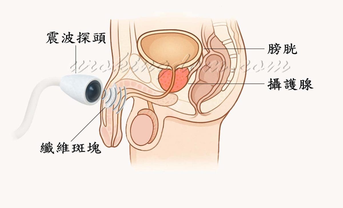 圖二:低能量體外震波衝擊陰莖斑塊區域,透過神經去敏化、抑制神經生長因子及產生過度刺激鎮痛效果,達到緩解疼痛的治療效果。