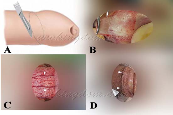 图一:精细的显微包皮环切手术。A)伤口切割线平行龟头的斜椭圆曲线,外型更美观 B)只修除浅浅薄薄的一层包皮 C)保留其下的组织及血管,组织破坏最少 D)以细致的缝合线缝合,手术后一周,表皮伤口复原良好。