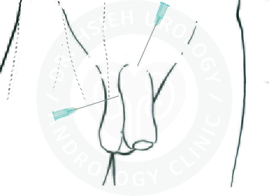 本院執行改良式陰莖靜脈截除手術,採用精準的雙重局部麻醉技術,包括背神經近枝阻斷術(proximal dorsal nerve block)及周陰莖基部組織阻斷(peripenile infiltration),只在陰莖根部注射局部麻醉藥物(圖3),有效麻醉時間約4-6小時,有充足的時間才能完成精細的手術,相對安全又方便,無半身麻醉或全身麻醉的風險。手術過程中清醒不會痛,可滑手機、使用藍芽耳機。手術後不需住院,亦不需要留下觀察,即可自由行走返家休息,甚少影響日常生活及工作。