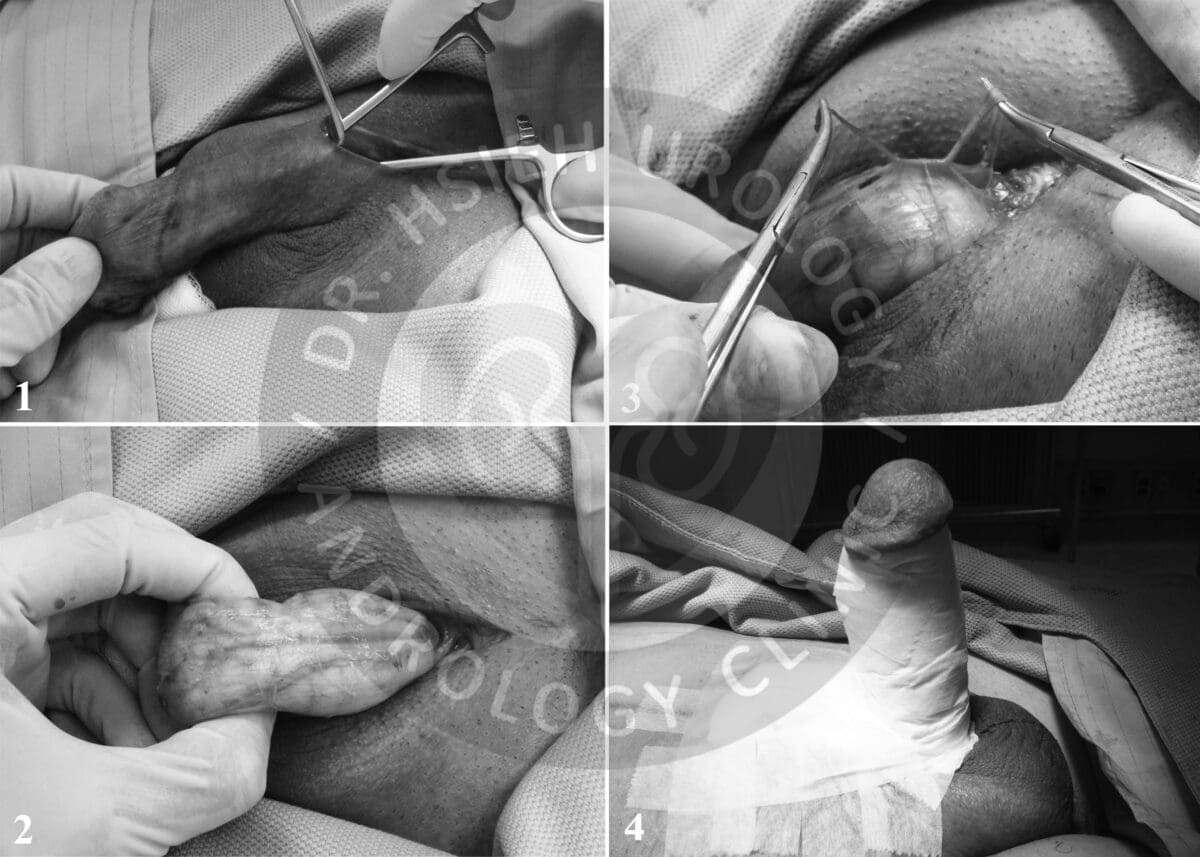 Using microsurgical techniques, a 3 cm vertical incision is made at the midline of the suprapubic skin. If combined with circumcision, a separate foreskin incision is added.