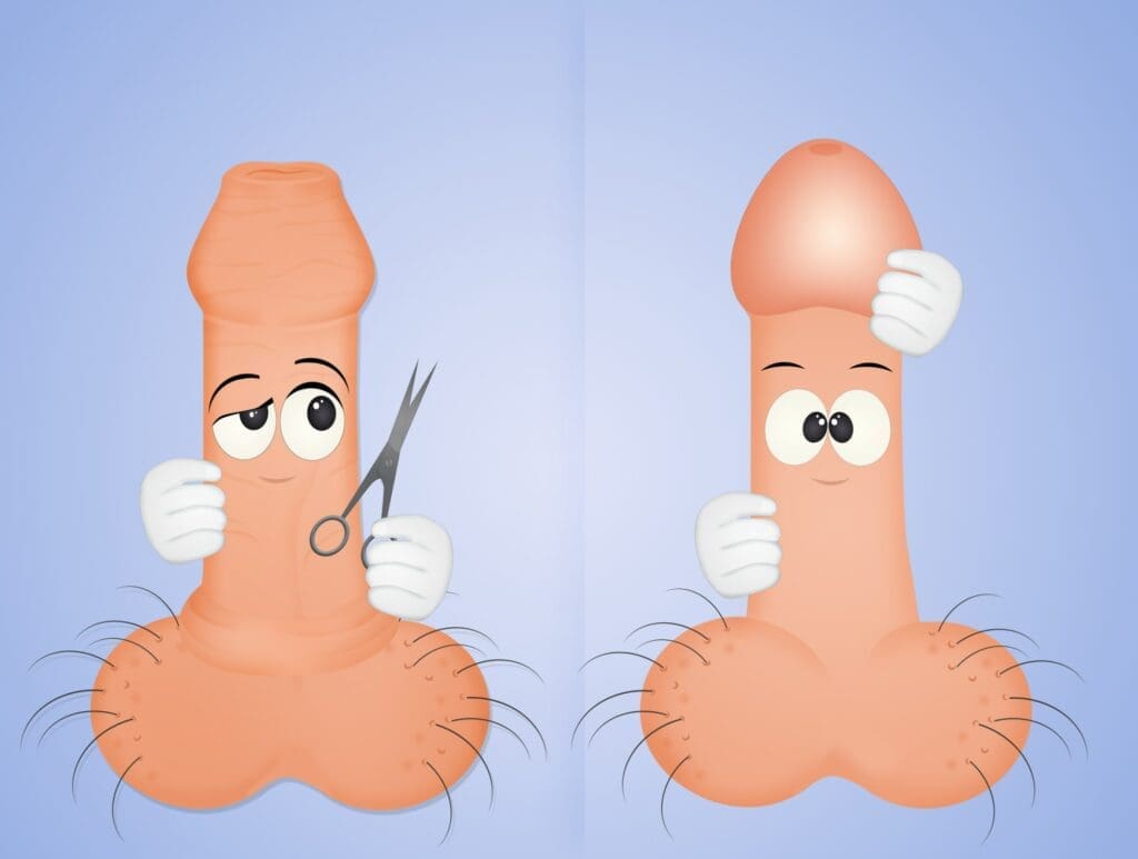 子供の場合、包皮が亀頭に癒着していることがあります。 これは、手術中に切り離す必要があります。 手術後数日間は、亀頭や包皮の一部を黄色い分泌物が覆い、次第に痂皮(かさぶた)に変化していきます。 1週間後、その下に新しい皮膚が伸びてくると、かさぶたは徐々に剥がれ落ち、通常の外観になります。