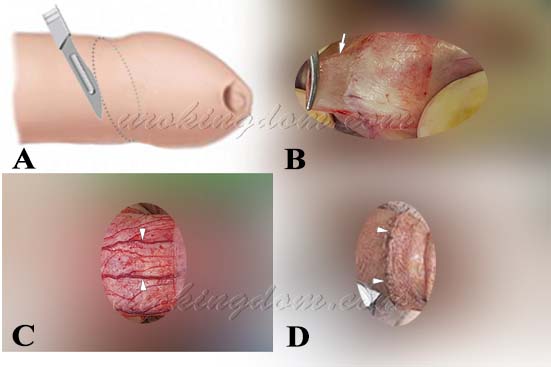 図1: 精密な顕微鏡下包茎手術。 A)切開ラインは亀頭の斜楕円曲線に平行で、審美性が高い。 B)必要最小限の包皮のみを切除。 C)血管・神経を温存し、組織損傷を最小限に抑制。 D)微細な縫合技術を用い、創部を精密に閉鎖しました。術後1週目のフォローアップにおいて、表皮創傷の良好な治癒を確認しました。
