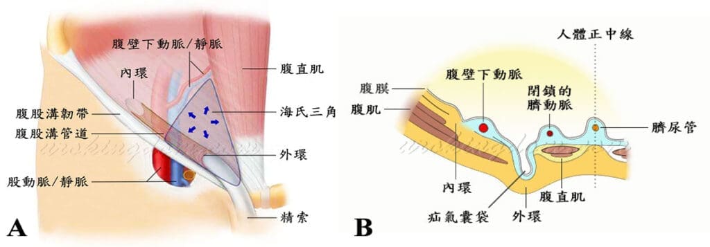 腹股溝三角(すなわちHesselbach三角) は、腹直筋の外縁、腹股溝靱帯、腹壁下動脈によって囲まれた三角形の領域であり、腹壁の先天的に最も薄弱な部位であり、老化によって腹股溝の腹壁が薄弱または欠損しやすくなります。内部の圧力が増加する状況や疾患(腹腔内の腫瘍、心不全、肺気腫による長期的な咳嗽、前立腺肥大による排尿時の力の必要性、便秘や重労働など)が加わると、薄弱な腹壁は内部の圧力によって徐々に外側に膨らみ、腹股溝の内側に異常な膨らみを形成し、直接型ヘルニアを引き起こします。