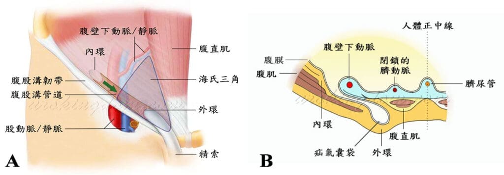 腹股溝三角(すなわちHesselbach三角) は、腹直筋の外縁、腹股溝靱帯、腹壁下動脈によって囲まれた三角形の領域であり、腹壁の先天的に最も薄弱な部位であり、老化によって腹股溝の腹壁が薄弱または欠損しやすくなります。内部の圧力が増加する状況や疾患(腹腔内の腫瘍、心不全、肺気腫による長期的な咳嗽、前立腺肥大による排尿時の力の必要性、便秘や重労働など)が加わると、薄弱な腹壁は内部の圧力によって徐々に外側に膨らみ、腹股溝の内側に異常な膨らみを形成し、直接型ヘルニアを引き起こします。